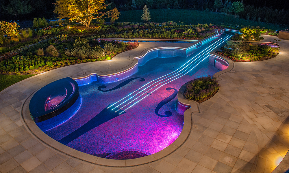Esta piscina con forma de violín Stradivarius se encuentra en Nueva York, concretamente en la residencia de Jay Dweck en Bedford. Este millonario es un apasionado de los violines y tuvo el deseo de poner en su mansión una piscina con la forma de un Stradivarius. Tiene unos 30 metros de largo y más de 400.000 baldosas de vidrio. Las cuerdas del violín están compuestas por más de 5.600 luces de LED.