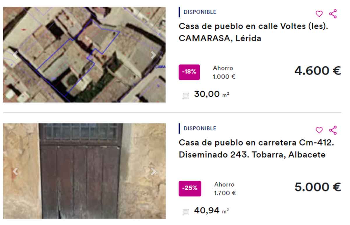 - El portal inmobiliario Solvia cuenta en su catálogo con pisos y casas a la venta por un precio de entre 2.000 y 3.000 euros. En concreto, se trata de viviendas en estado de ruina que necesitan reforma integral. Destaca una promoción de viviendas en Tarragona por 2.736 euros cada una que tienen 80 metros cuadrados, dos habitaciones y un baño.