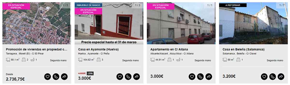 Son los más baratos. Casas y pisos de banco para reformar, en algunos casos en estado de ruina y ubicados en zonas y barrios alejados de las grandes urbes. Pero su precio es indiscutible. A continuación puedes consultar una selección de las viviendas de banco más baratas que puedes comprar en los distintos servicer inmobiliarios.