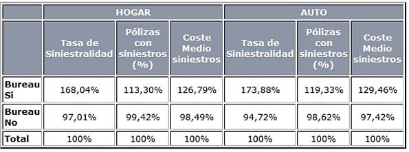El siguiente cuadro muestra la relación entre la siniestralidad en Hogar y Auto de los individuos que forman parte de un Bureau de Crédito y los que no, donde se puede apreciar la diferencia entre ambos:
