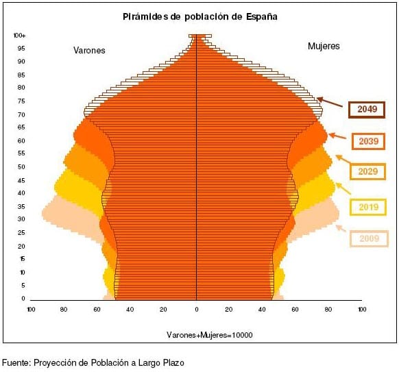 Las tendencias demográficas actuales llevarían a una reducción progresiva del crecimiento poblacional en las próximas décadas, según la Proyección de la Población de España a Largo Plazo, 2009-2049, elaborada por el Instituto Nacional de Estadística (INE). Esto podría suponer, de continuar esta tendencia, que por cada 10 personas en edad de trabajar, en 2049 residirían en España casi nueve personas potencialmente inactivas (menor de 16 años o mayor de 64), alcanzándose una tasa de dependencia del 89,6 %, desde el 47,8 % actual. La población mayor de 64 años se duplicaría en 40 años y pasaría a representar más del 30 % del total debido al envejecimiento de la pirámide poblacional