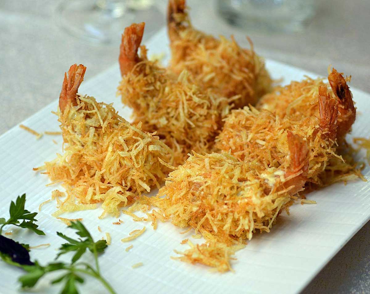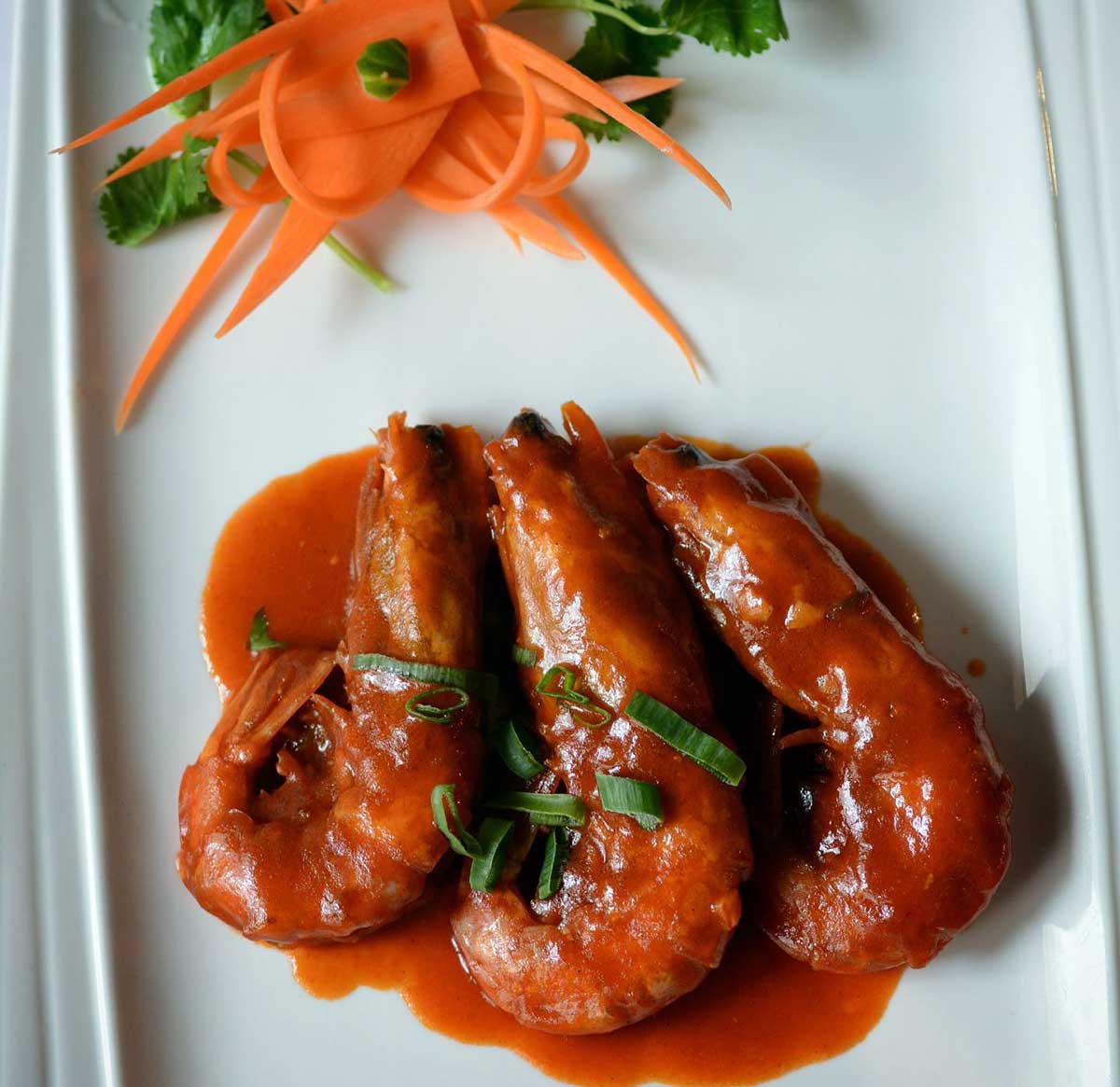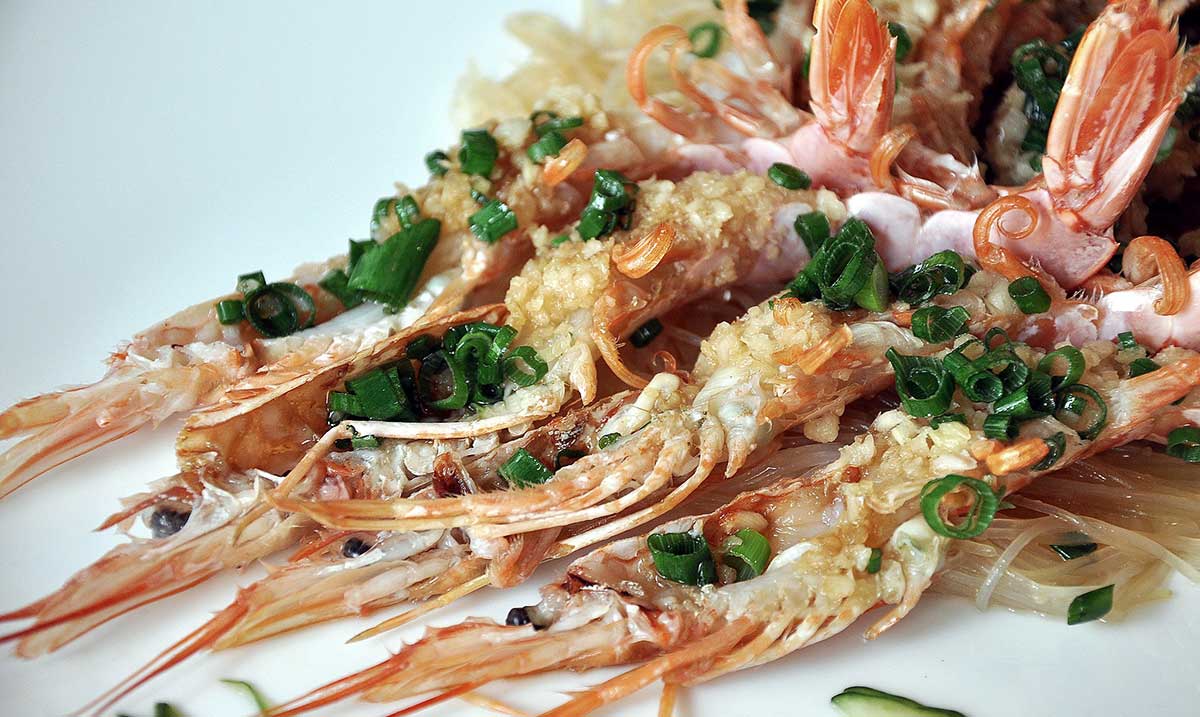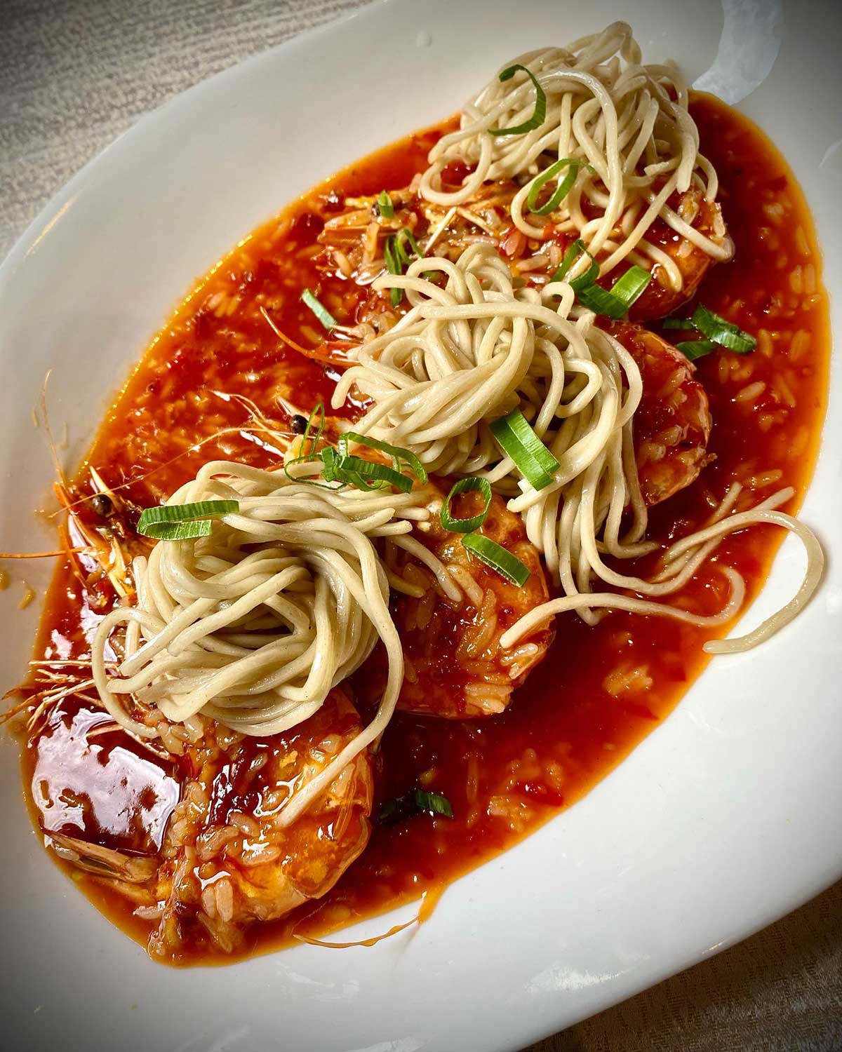 Dentro de la carta destaca la sección de especialidades y platos recomendados por el chef. Algunas de ellas son los langostinos a la naranja con arroz frito por 12 euros.