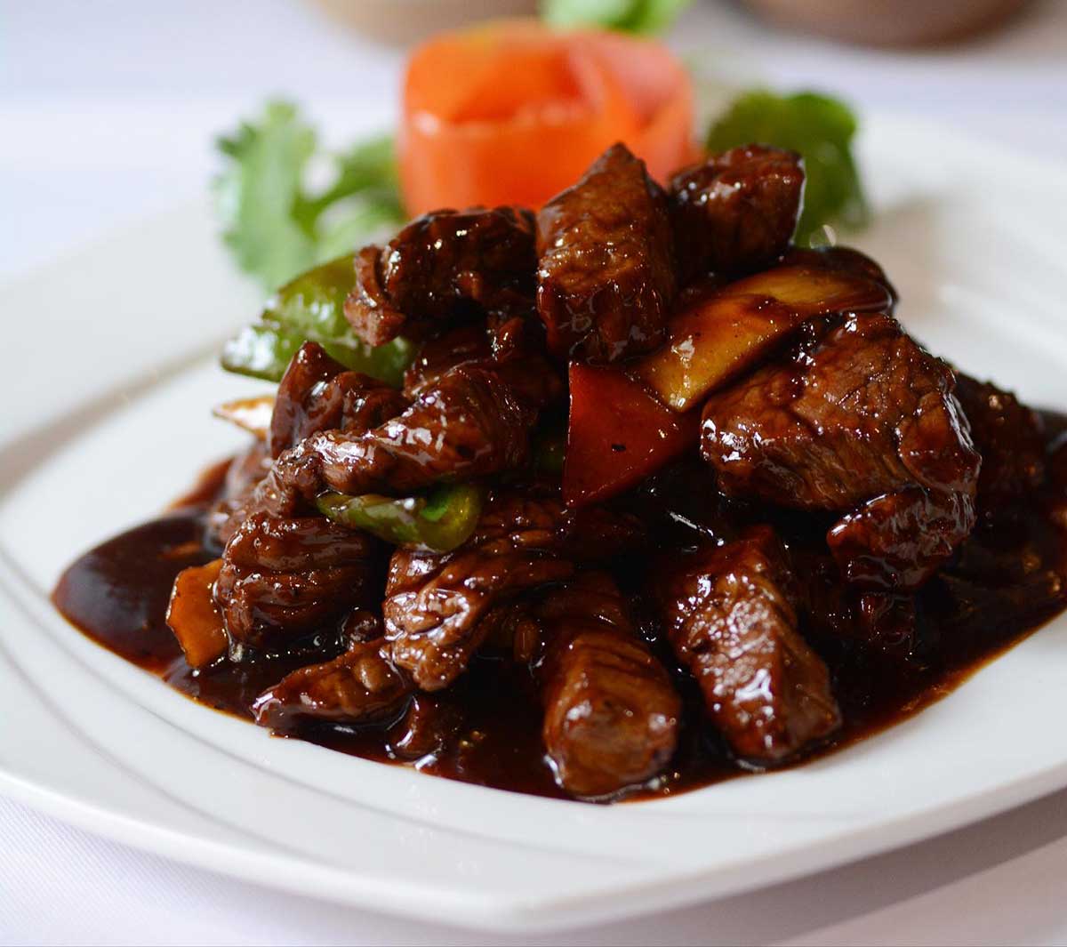 Platos de carne como ternera a la pimienta, cerdo ibérico, costilla agridulce o lomo de ternera completan la carta.