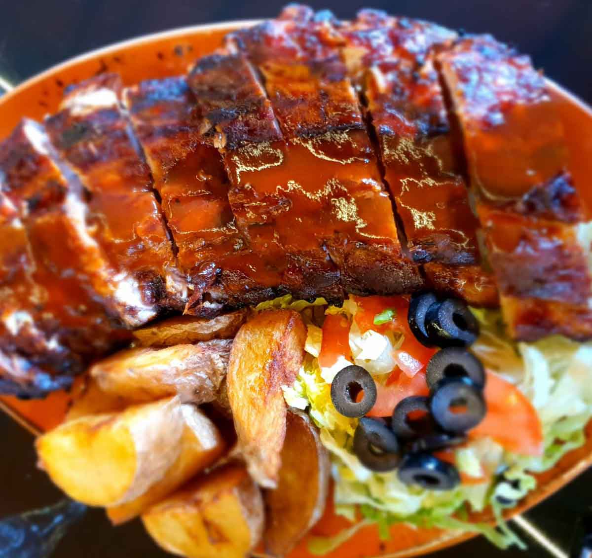 La carta cuenta con un apartado específico de barbacoa, donde destacan las siguientes elaboraciones. Cuello de cerdo a la plancha, patas de pollo a la brasa con patatas, chuleta de cerdo a la plancha, pechuga de pollo, hamburguesa, costillas, pollo picantón o churrasco de ternera, entre otros. Los precios se sitúan entre los 15 y los 30 euros.