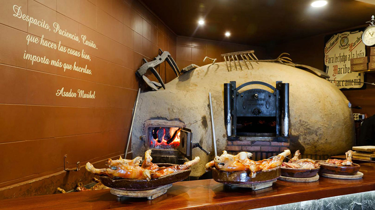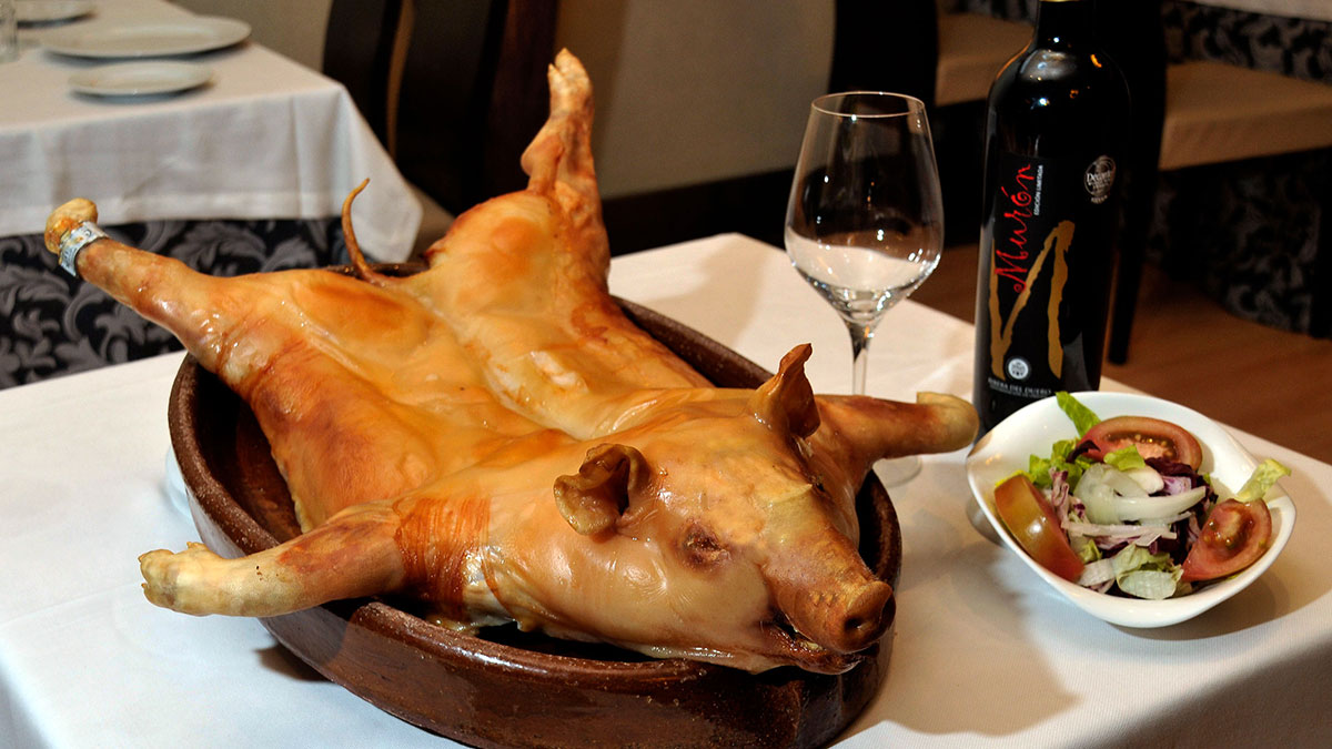 El asado del cochinillo, que en este restaurante tiene un peso de entre 4,5 y 5 kilogramos, tiene 21 días como máximo y la crianza se produce en granjas dedicadas en exclusiva a esta tarea en la provincia de Segovia. Además, siguiendo la tradición de la ciudad, el cochinillo en este local también se trincha con el canto de un plato. ¿El objetivo? Demostrar la ternura de la carne y el toque crujiente de la piel.