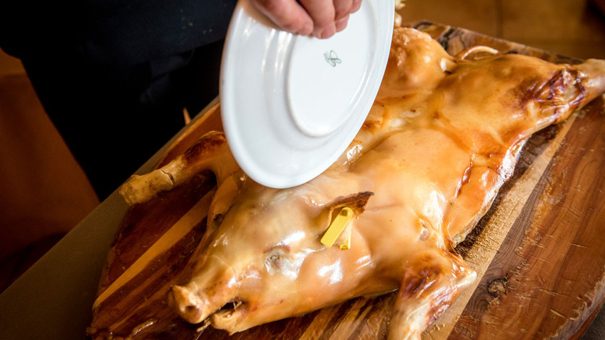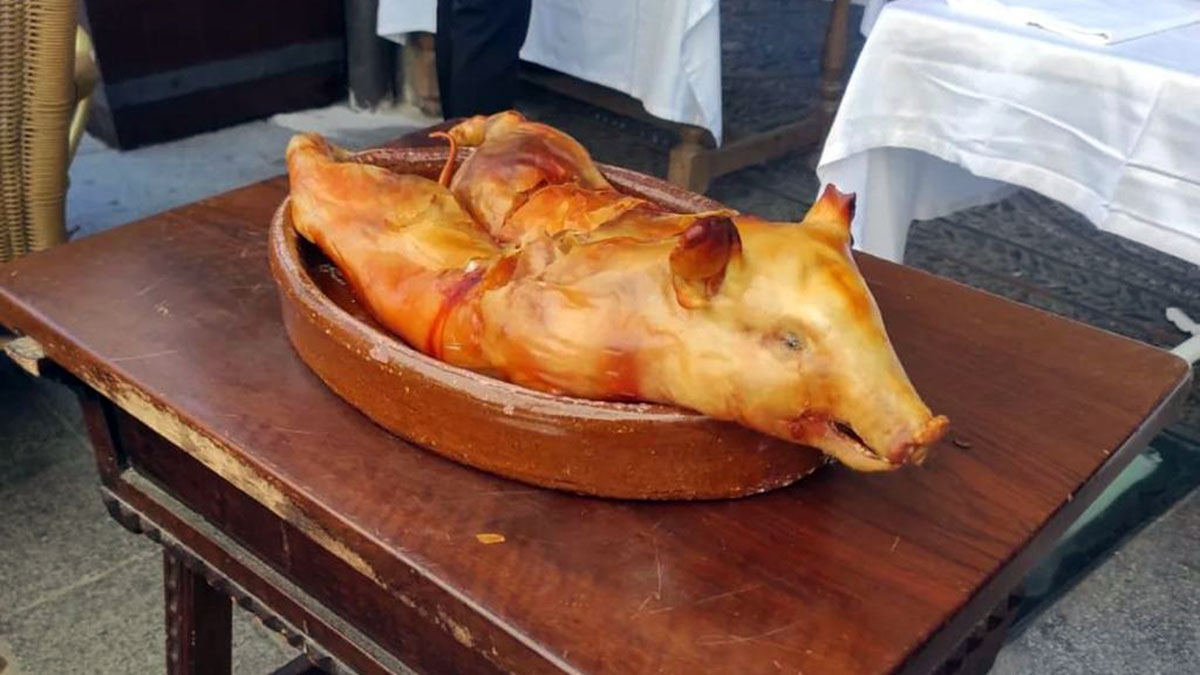 El cochinillo se sirve por porciones individuales y cada una cuesta casi 30 euros sin guarnición. Aunque si quieres ver el producto íntegro, puedes pedirles a los camareros que te traigan el cochinillo entero para verlo, como aparece en la siguiente imagen.
