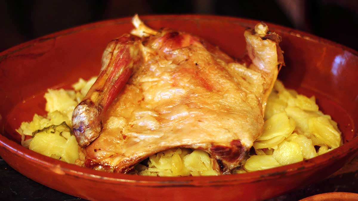 Lechal al horno de leña con patata panadera para dos personas por 56 euros.