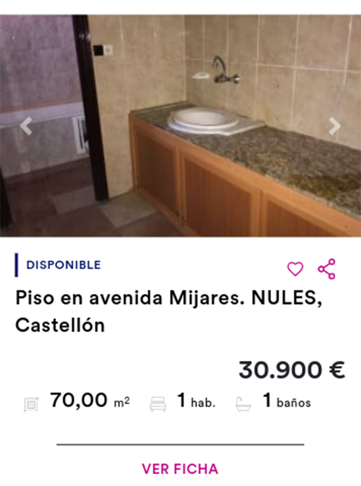 Piso por 30.900 euros en Nules, Castellón. Es una vivienda que tiene 70 metros cuadrados con una habitación y un baño. Está catalogado como una oportunidad de inversión, dado que necesita una reforma. Cuenta con una calificación energética de tipo E y fue construido en el año 1952.