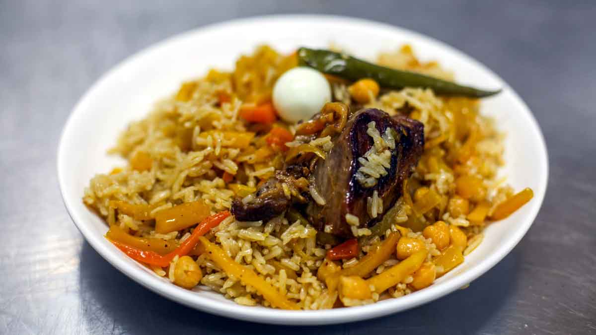 Un plato de arroz con carne de cordero o pollo, cocido con especias y servido con verduras.