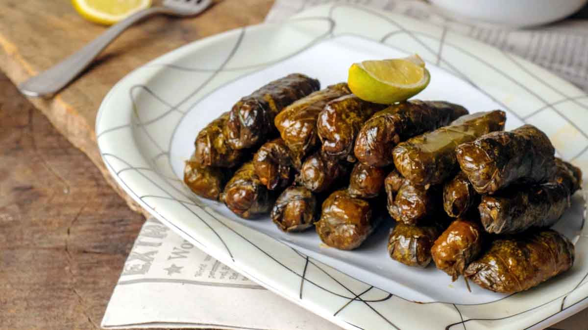Hojas de parra rellenas de arroz y carne, cocidas en un caldo.