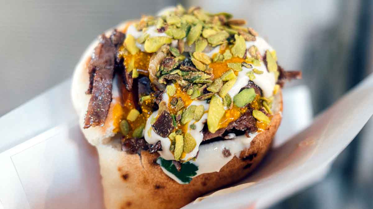Una de las comidas rápidas más populares de la cocina árabe, que consiste en carne marinada en especias, cocida en un asador vertical y servida en un pan pita con verduras y salsa.