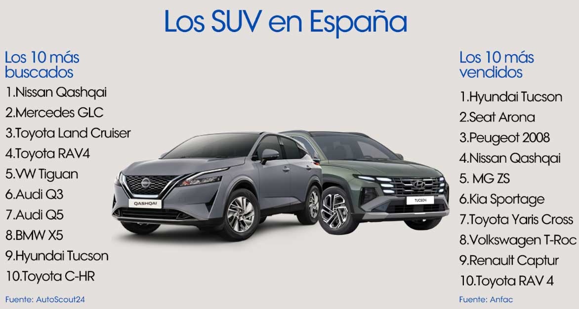 En el caso de los 10 modelos SUV más buscados, seis de ellos pertenecen a marcas generalistas (Nissan Qashqai, Toyota Land Cruiser, Toyota RAV4, Volkswagen Tiguan, Hyundai Tucson y Toyota RAV4) y los cuatro restantes a fabricantes premium (Mercedes GLC, Audi Q3, Audi Q5 y BMW X5).