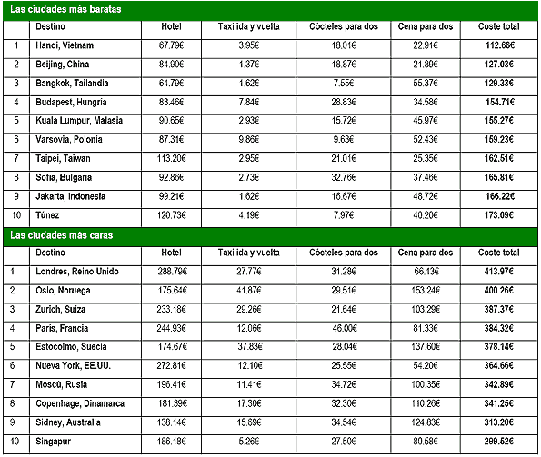 -el precio medio de dos taxis (ida y vuelta) Los precios de hotel indican el coste medio de una habitación doble en hoteles de cuatro estrellas que pueden encontrarse en TripAdvisor (a través de páginas web colaboradoras de reservas como agencias de viaje online o proveedores directos de hoteles) en cada destino para el periodo de verano (1 de junio al 31 de agosto 2012).
