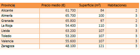 Las viviendas están sobre todo en municipios de las provincias de Granada, Toledo, Alicante, Valencia, Zaragoza, Almería, Lleida o La Rioja y tienen una media de unos 100 metros cuadrados y cuentan con 3 dormitorios.
