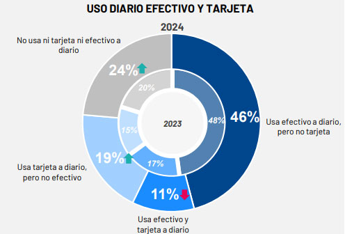 En el ámbito comercial, los pequeños negocios han adoptado métodos mixtos. Aproximadamente un 40 % de las transacciones en estos establecimientos se realizan mediante tarjeta, mientras que un 37 % se efectúan en efectivo. Este equilibrio refleja cómo los comercios se adaptan a las necesidades de sus clientes, combinando métodos tradicionales con las expectativas de pago digital.