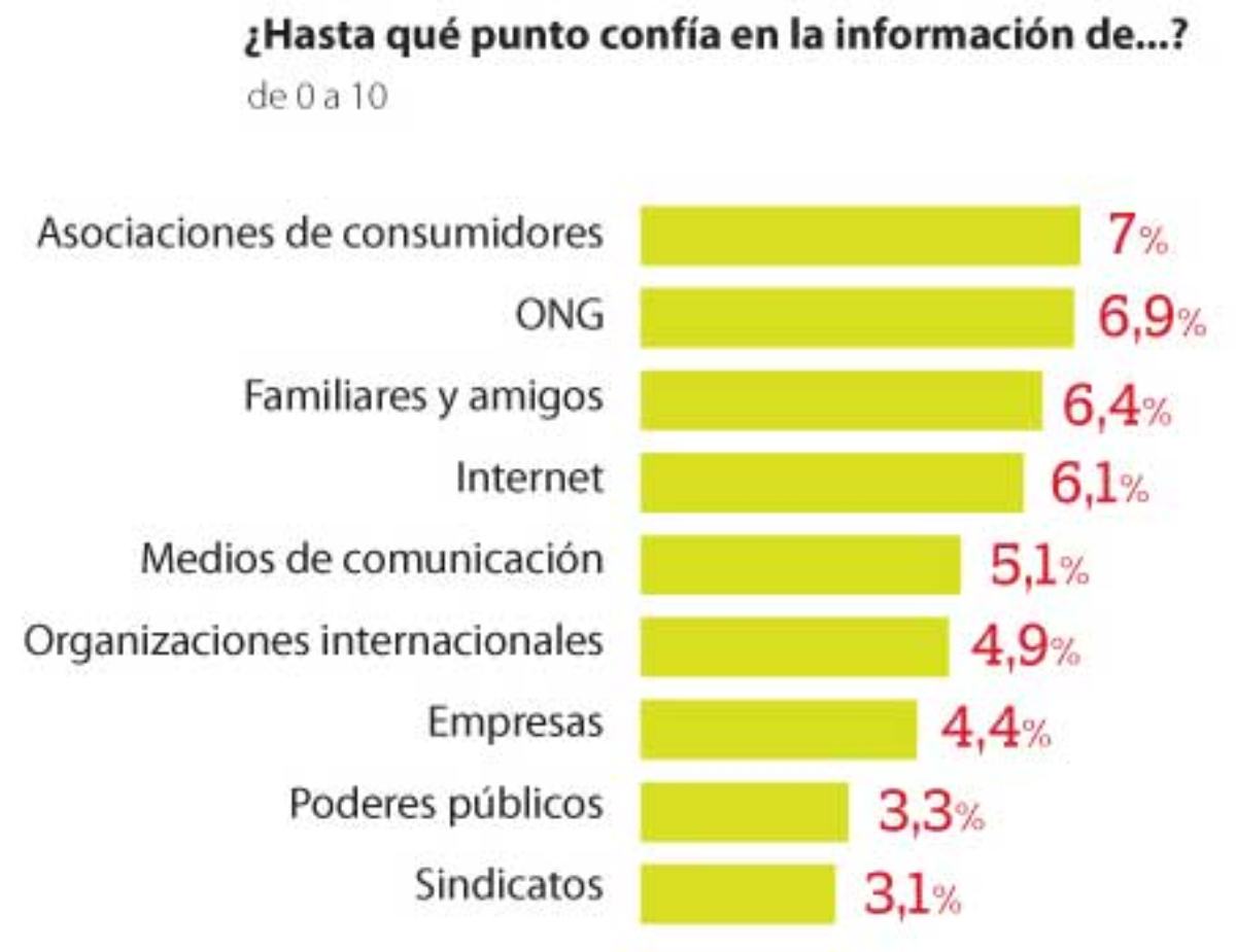Tú, ¿en qué datos confías más? ¿En la información de las instituciones de Gobierno? ¿De los medios de comunicación? Según la Organización de Consumidores y Usuarios (OCU) no nos fiamos de las fuentes de información tradicionales. Con motivo de un estudio para conocer los sectores empresariales más responsables y con más políticas éticas, ha surgido esta interesante conclusión. La OCU añade que nuestras compras diarias son el motor del cambio. La mayoría de los 425 encuestados compra o deja de comprar un producto a partir de la información que tiene sobre el comportamiento ético de una empresa. El problema es que nos falta información fiable.