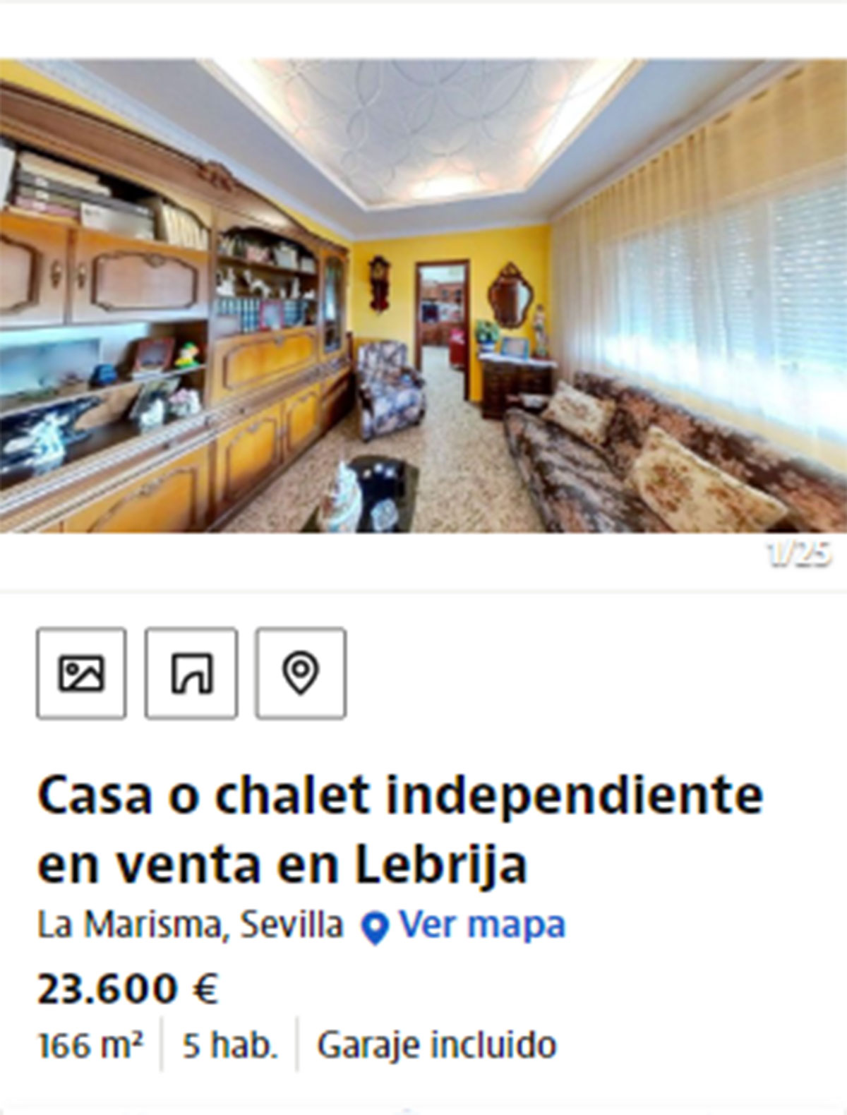 Chalet independiente a la venta en La Marisma, Sevilla. Es una vivienda que tiene 166 metros cuadrados con cinco habitaciones y un garaje incluido en el precio. No está disponible para vivir, sino que se trata de una oportunidad para inversores. Se vende la nuda propiedad de la vivienda que tiene un total de dos plantas, una terraza y un baño. No dispone de calefacción.