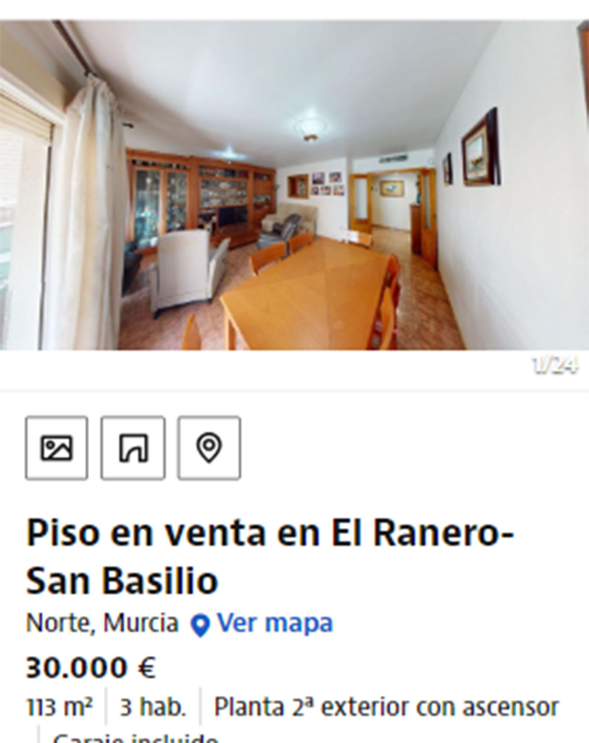 Piso en venta en Norte, Murcia, por 30.000 euros. Es una vivienda de 113 metros cuadrados con tres habitaciones y dos baños. Se trata de un segundo sin ascensor que tiene una plaza de garaje incluida en el precio. Es una oportunidad para inversores porque no es posible entrar a vivir en la actualidad. Cuenta con un balcón, trastero y la vivienda está construida en el año 2001.