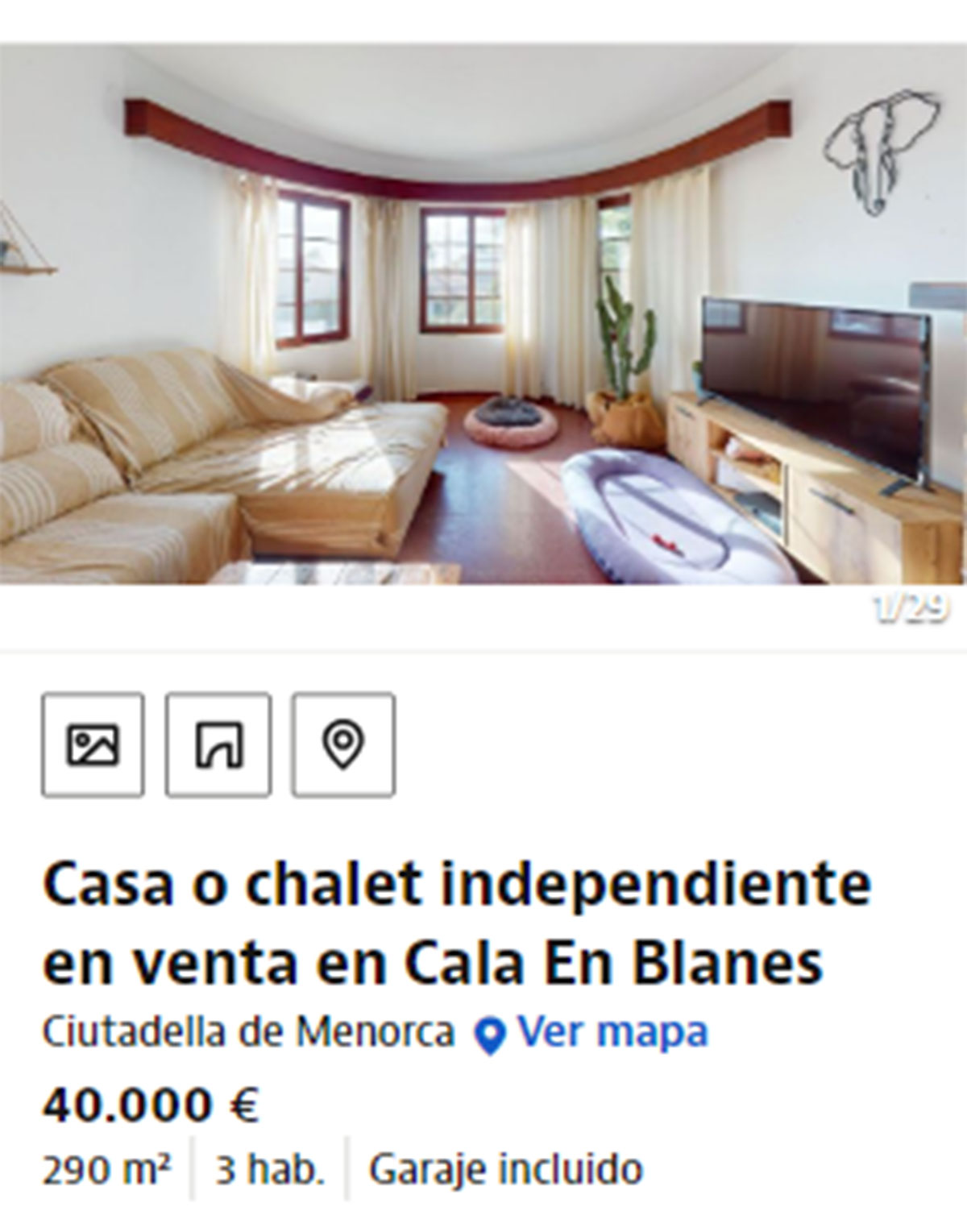 Casa en venta en Menorca por 40.000 euros. Se trata de una vivienda de 290 metros cuadrados con tres habitaciones y garaje incluido. Es una oportunidad para invertir porque se vende la nuda propiedad. Cuenta con jardín, terraza, dos baños y armarios empotrados. Es una vivienda para reformar que no tiene calefacción.