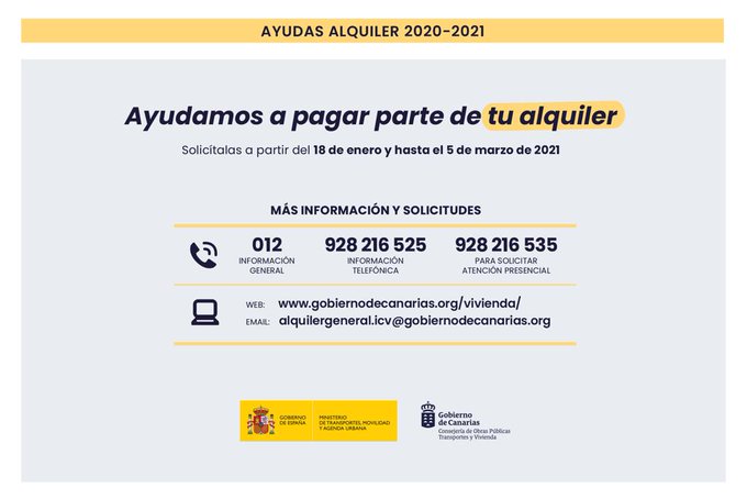 Esta ayuda al alquiler, cofinanciada con el Estado, cuenta con un presupuesto total de 17,5 millones de euros y supone uno de los primeros programas del Plan de Vivienda de Canarias 2020 – 2025.