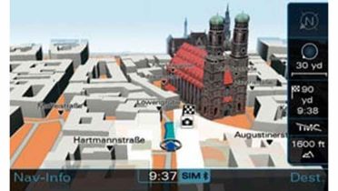 La pantalla grande también muestra otra de las atractivas innovaciones del sistema MMI: la presentación de los mapas cuando se utiliza la navegación. El conductor puede elegir entre la presentación convencional bidimensional o las nuevas imágenes tridimensionales. Esta perspectiva a vista de pájaro incluye numerosos y cuidados detalles. Además, las distintas altitudes sobre el nivel del mar se visualizan en varios colores, igual que en un atlas, y los edificios más importantes de las grandes ciudades aparecen en 3D.