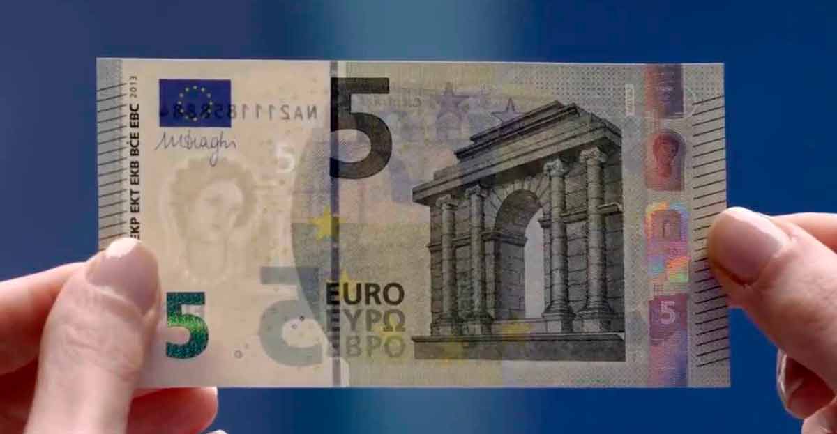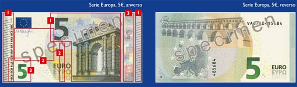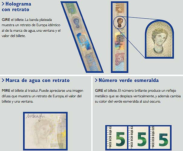 El billete de cinco euros nuevo es el resultado de los avances realizados en el ámbito de la tecnología de billetes desde la introducción de la primera serie hace más de diez años, e incorpora elementos de seguridad nuevos y mejorados. La marca de agua y el holograma muestran un retrato de Europa, personaje de la mitología griega que da nombre a esta serie de billetes. El llamativo ‘número verde esmeralda’ cambia su color del verde esmeralda al azul oscuro y produce un reflejo metálico que se desplaza verticalmente. En los bordes izquierdo y derecho del billete pueden apreciarse unas líneas cortas en relieve que permiten identificarlo con mayor facilidad, especialmente a las personas con problemas de visión.