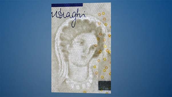 El billete de 5 euros de la serie Europa es el resultado de los avances realizados en el ámbito de la tecnología de billetes desde la introducción de la primera serie hace más de diez años, e incorpora elementos de seguridad nuevos y mejorados. La marca de agua y el holograma muestran un retrato de Europa, personaje de la mitología griega que da nombre a esta serie de billetes.