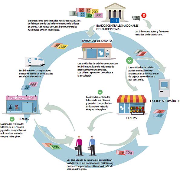 El Eurosistema dedica esfuerzos considerables a garantizar que los ciudadanos y los profesionales que manejan efectivo dispongan de la información adecuada sobre cómo reconocer un billete falso y que las máquinas de tratamiento y procesamiento de billetes puedan identificar con fiabilidad los billetes falsos y retirarlos de la circulación.