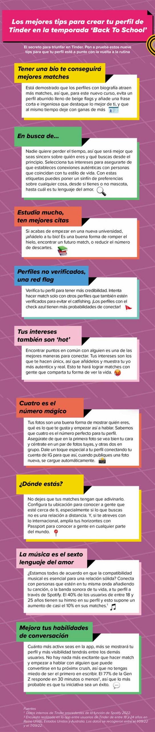 Para que los universitarios que dan sus primeros pasos en esta plataforma no estén perdidos, Tinder ha elaborado un ‘Kit de la vuelta al cole’ que pretende a ayudar a los más despistados a tener éxito en la aplicación de citas. Se trata de una guía sencilla que permite conocer los mejores trucos y tips para crear el perfil perfecto en la aplicación antes de adentrarse en el mundo de las citas. Porque tal y como explican desde la compañía, tener un buen perfil les ayudará a disfrutar de la experiencia en Tinder de una forma divertida, sana y segura, que llenará su primer año universitario de anécdotas y nuevas conexiones muy especiales.