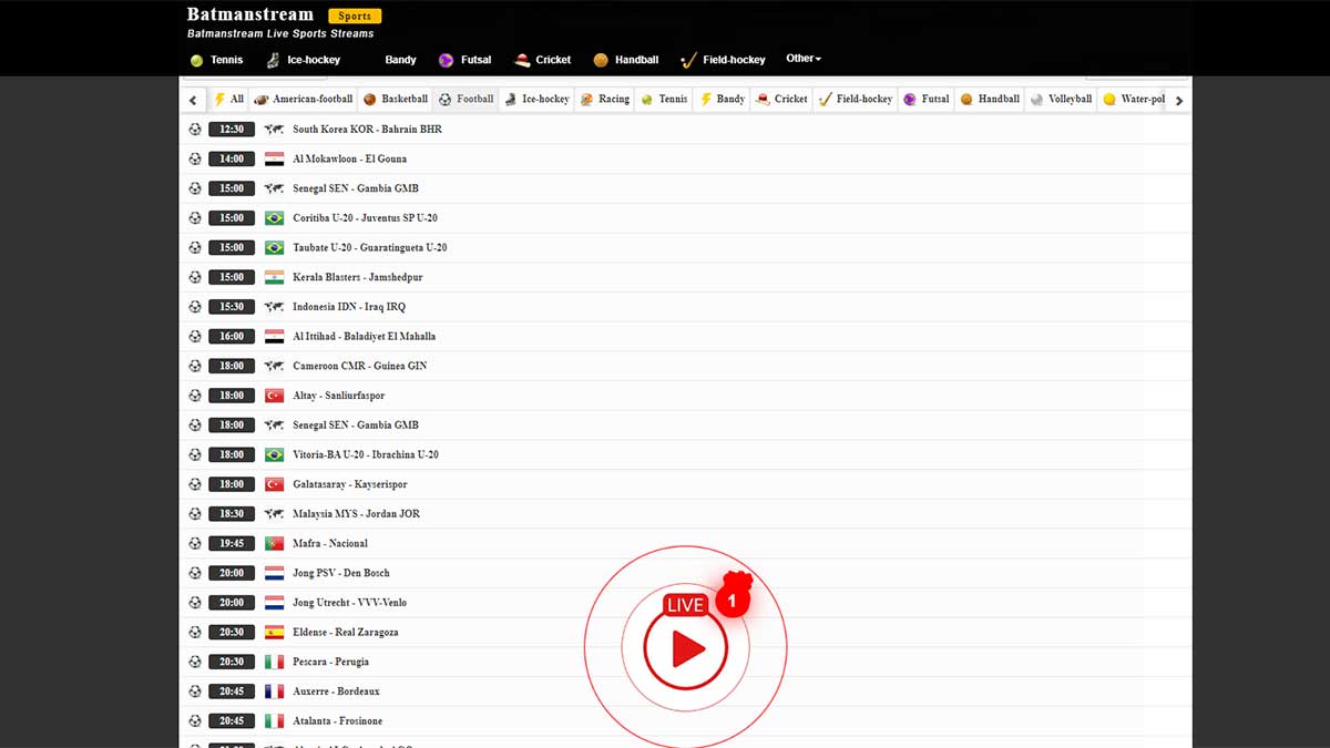 Si quieres ver cualquier competición futbolera del mundo u otros deportes, Batmanstream es la página web más completa. Solo tienes que acudir a su barra de navegación en la parte superior de la pantalla y elegir el deporte que quieras ver. Eso sí, es posible que te aparezca mucha publicidad al pinchar sobre uno de los enlaces.