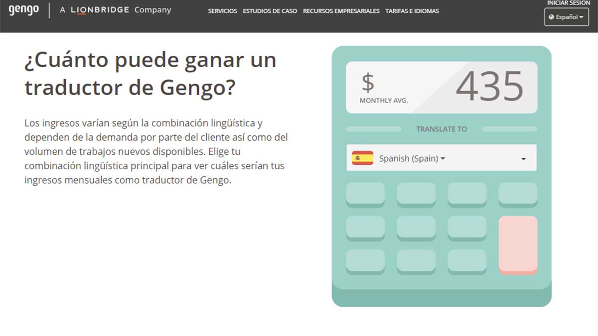 La cantidad de dinero que puede ganar un traductor de Gengo varía en función del idioma de los textos que pueda traducir, así como de la demanda de los diferentes clientes y el volumen de trabajo. Aunque, de media, un usuario que realice traducciones al español puede conseguir unos 435 dólares aproximadamente al mes, tal y como aparece en la calculadora disponible en la web de Gengo.