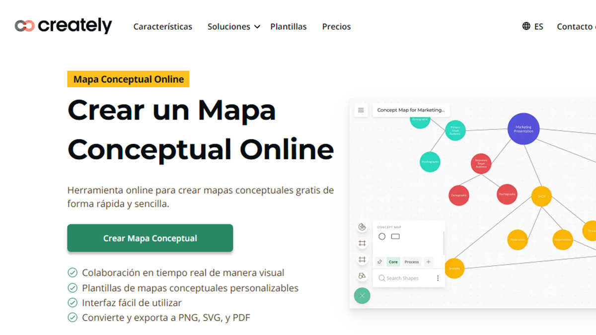Creately es una herramienta sencilla de utilizar con la que puedes crear mapas conceptuales gratis en cuestión de minutos.