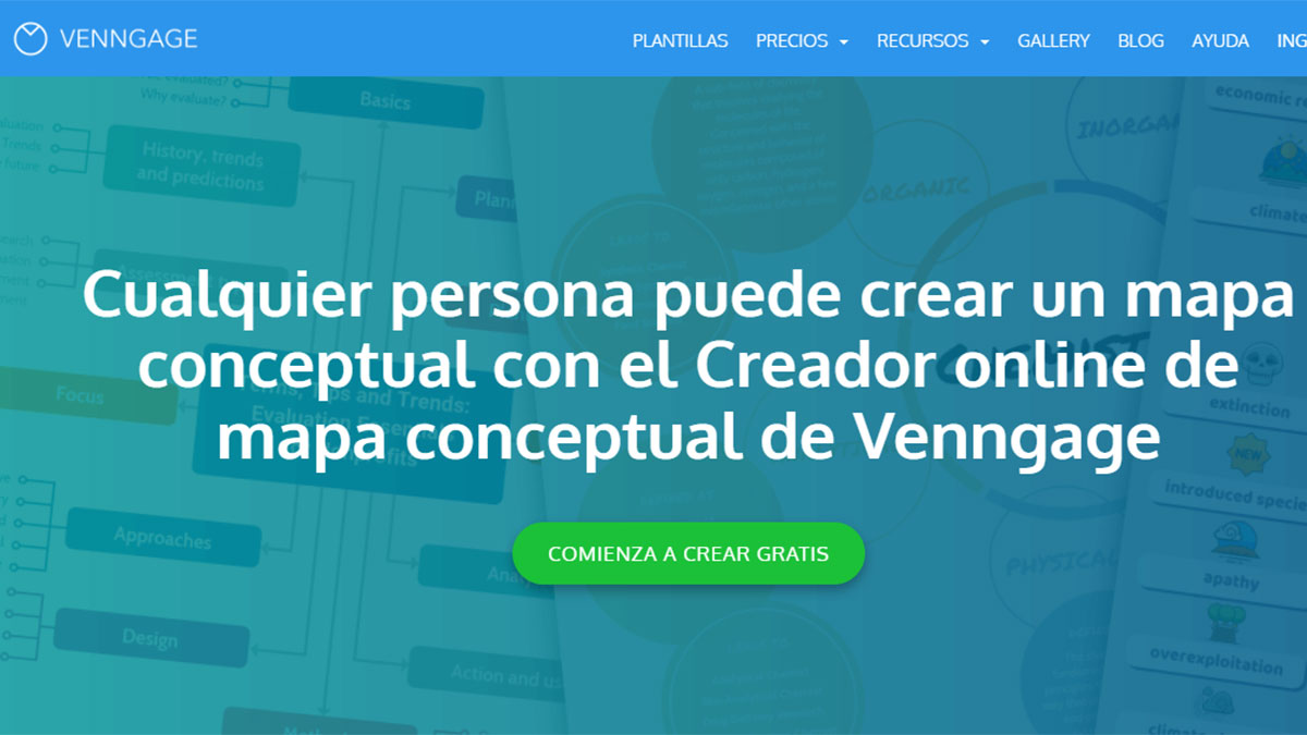Venngage es una plataforma gratuita y fácil de utilizar para crear mapas conceptuales. Ofrece un catálogo de plantillas para que puedas utilizarla como base de los proyectos y configurarlo después para darle un toque distintivo y personal.