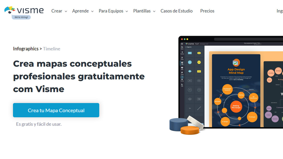 Visme es una herramienta en la que puedes crear mapas conceptuales profesionales gratis. Aunque como requisito, para usar los servicios de esta web hay que registrarse mediante una cuenta de correo electrónico.