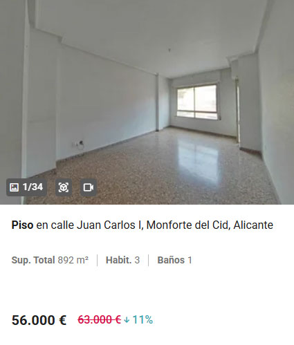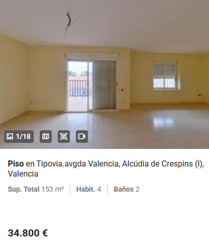 Las ofertas más baratas que tiene Aliseda en su catálogo de pisos en la Comunidad Valenciana, parte desde los 34.000 euros. También se venden viviendas por menos de este precio, pero bien están ocupadas ilegalmente por terceros o bien se encuentran en una situación de deterioro importante.