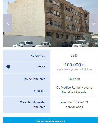 De forma específica, en cada uno de los anuncios de los inmuebles que están publicados en este portal aparecen todos los detalles e información relevante sobre este activo. Desde fotografías de la vivienda, hasta una breve descripción de la misma y su ficha completa.