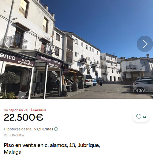 Piso por 22.500 euros en la localidad de Jubrique. Se trata de una vivienda que tiene tres habitaciones y dos baños distribuidos en 80 metros cuadrados. El precio cuenta con una rebaja aplicada del 7 %, lo que supone un ahorro de algo menos de 2.000 euros de su importe original. La vivienda cuenta con un salón comedor y cocina y está ubicada en un entorno de zona boscosa y rodeada de naturaleza y vegetación. Está bien comunicada por carretera y cuenta con acceso fácil a servicios básicos.