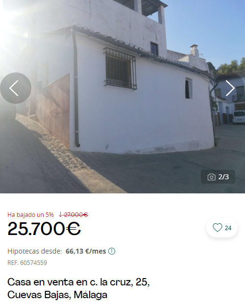 Piso en venta por 44.600 euros en Cuevas Bajas, Málaga. Es una vivienda cuyo precio ha bajado un 10 %, lo que supone un ahorro en el precio de aproximadamente 5.000 euros. Cuenta con tres habitaciones y un baño distribuidos en 186 metros cuadrados. Tiene una terraza superior y la casa es de los años 70. Es una casa de pueblo ubicada en la localidad que cuenta con un salón comedor y cocina independientes.