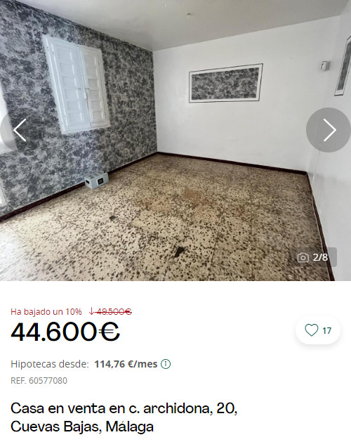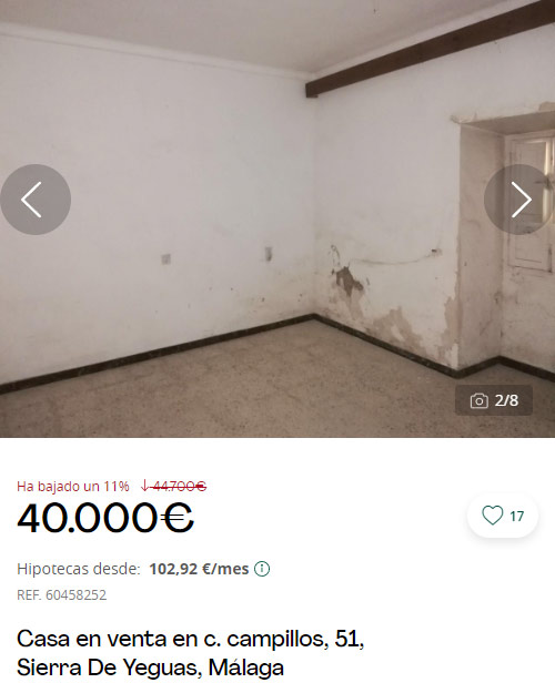 Piso en venta por 40.000 euros en la localidad malagueña de Yeguas. Se trata de una vivienda cuyo precio ha bajado un 11 %, lo que permite un ahorro de algo menos de 5.000 euros respecto al importe original. Es una casa que tiene tres habitaciones y un baño distribuidos en 168 metros cuadrados. El inmueble se vende con un trastero que está incluido en el precio y un patio privado. Es una casa adosada unifamiliar construida en los años 60 que cuenta con buenas comunicaciones y fácil acceso.