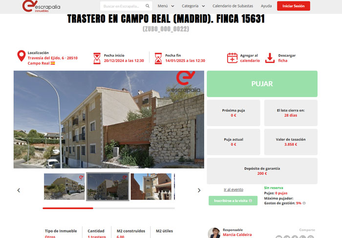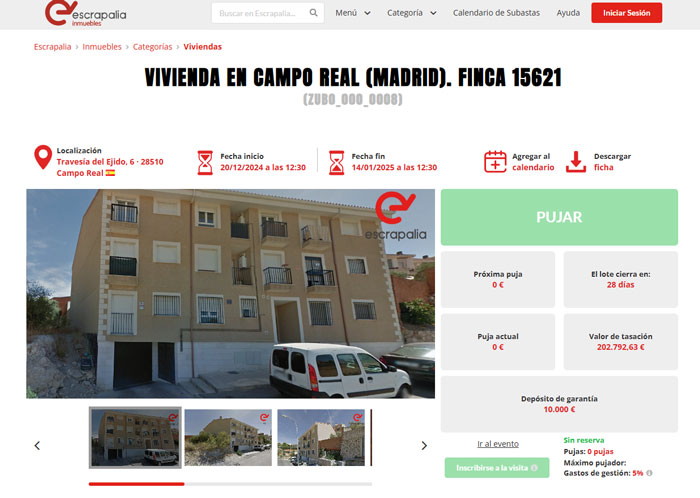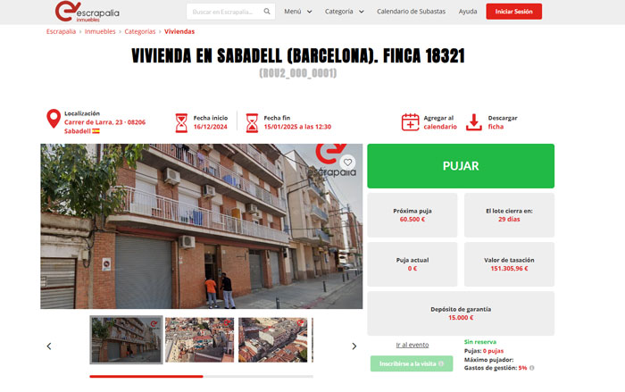 El portal web Escrapalia subasta viviendas a partir de 60.000 euros. Se trata de una oportunidad inmejorable para invertir en inmuebles que se encuentran a 40 minutos del centro de Madrid y Barcelona. Concretamente, los lotes se ubican en los municipios de Campo Real y Sabadell, respectivamente. Además de los inmuebles, también es posible pujar por trasteros y plazas de garaje.