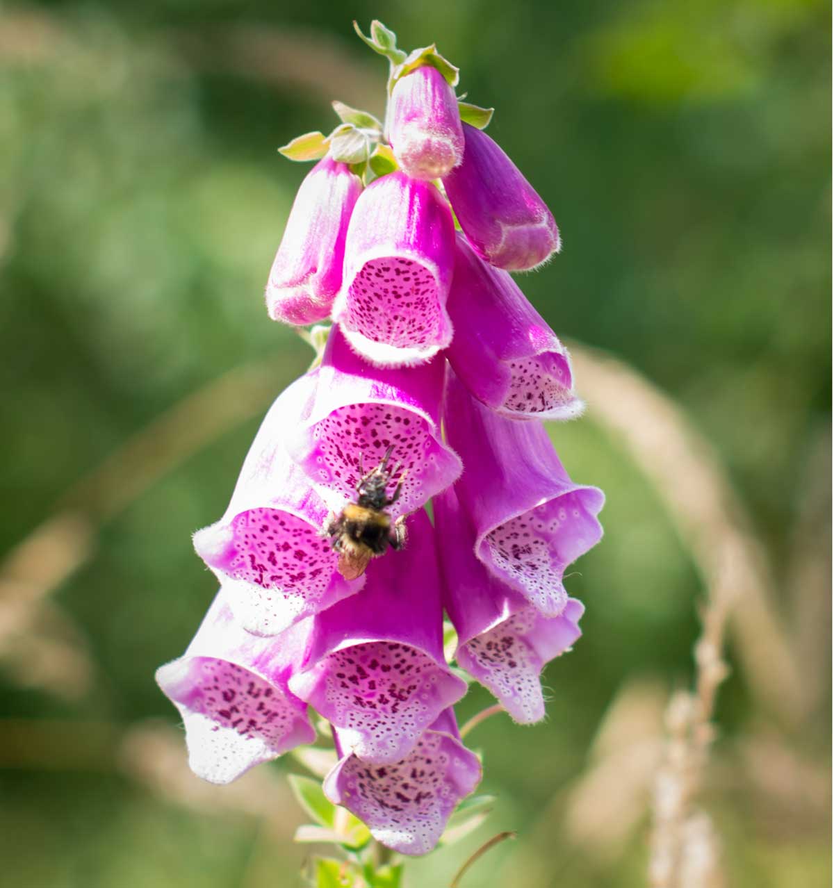 La planta de la dedalera debe su nombre a que sus flores tienen forma de dedal, como se muestra en la siguiente imagen. Esta planta, de hojas anchas, parece inofensiva, pero puede provocar ataques al corazón si se ingiere.