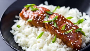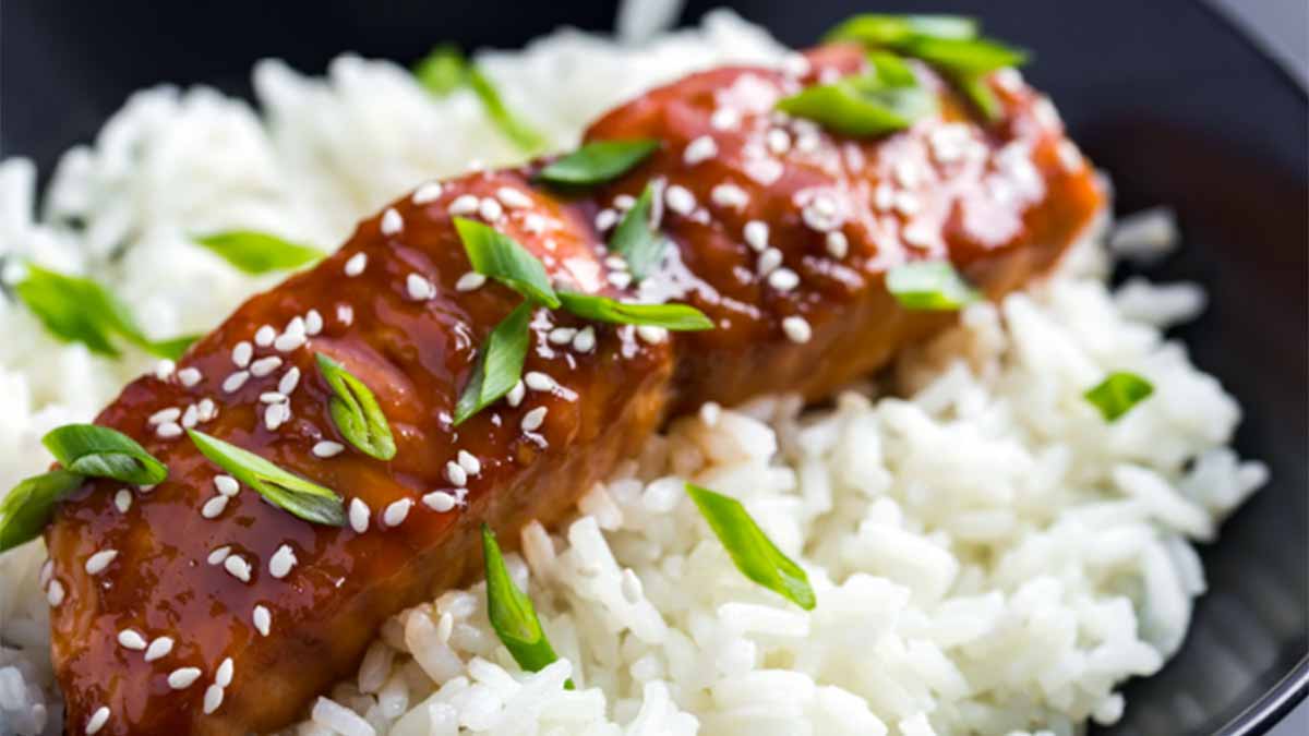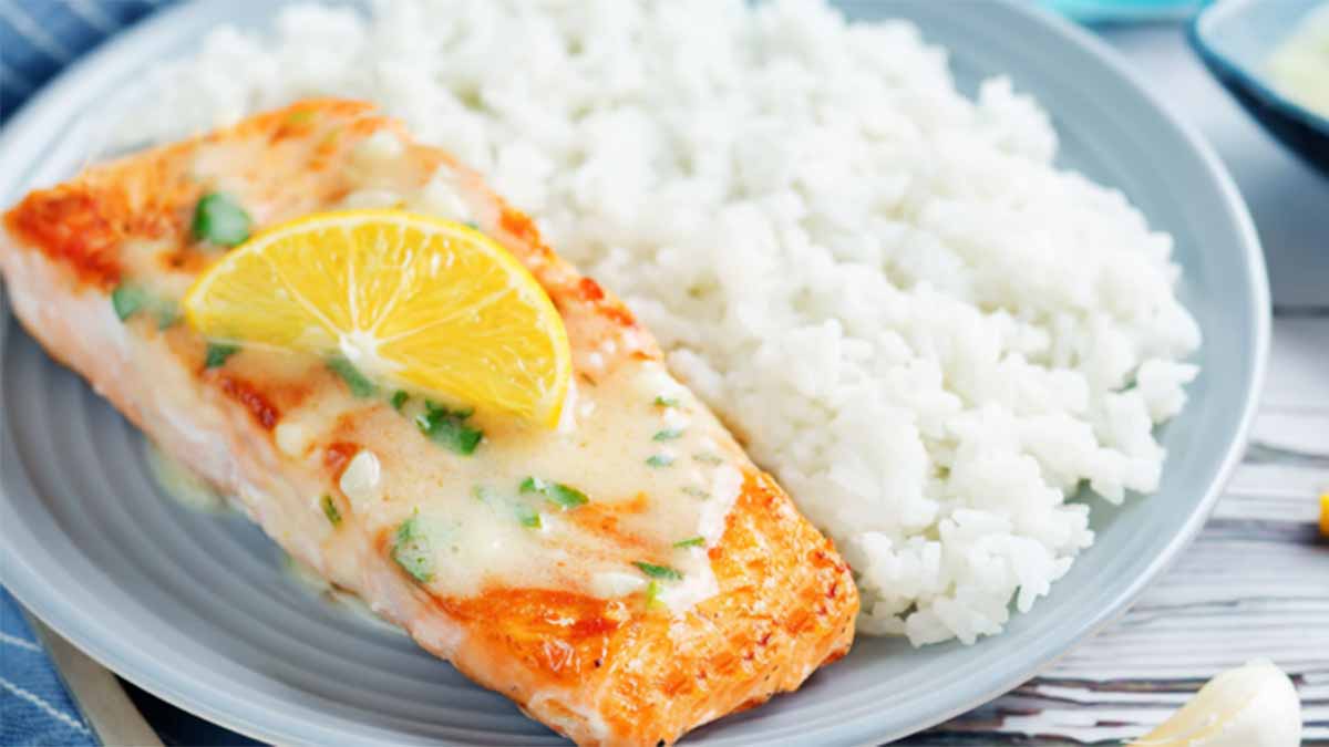 - Sirve los filetes de salmón con arroz y cúbrelos con la salsa.