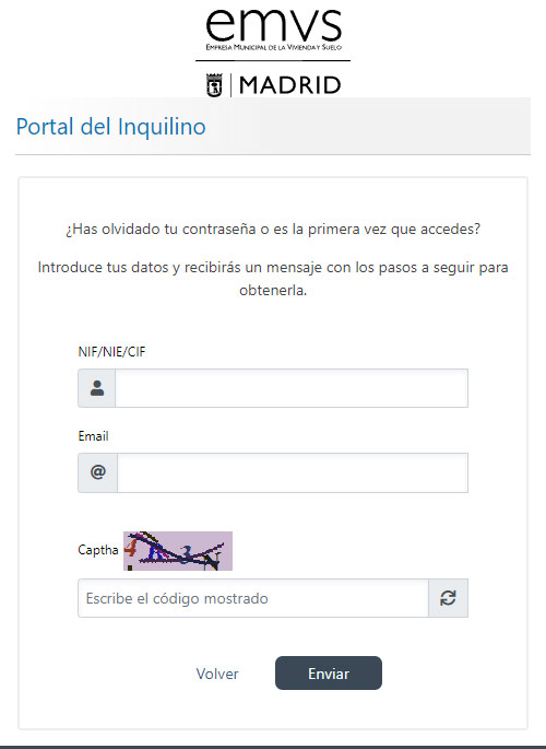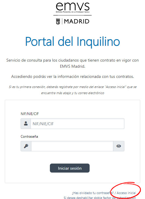 Al pulsar en este enlace, se abre una nueva pantalla para acceder al portal. En concreto, en esta nueva pantalla el organismo indica que es un servicio de consulta para ciudadanos con contrato en vigor con la EMVS en Madrid y que es necesario registrarse en el caso de ser la primera vez. Para ello, hay que pulsar el botón que dice ‘Acceso inicial’ que se encuentra en la parte inferior derecha de la pantalla.