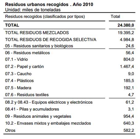 En España se recogieron 412,5 kilogramos de residuos urbanos mezclados por persona y año según la encuesta sobre la Recogida y el Tratamiento de Residuos del Instituto Nacional de Estadística (INE) del año 2010. Por lo que respecta a los residuos urbanos procedentes de la recogida selectiva, se recogieron 31,2 kg. por persona y año de papel y cartón (un 32,9 % más que en 2009) y 17,1 kg. de vidrio (un 14,3 % más que en 2009).