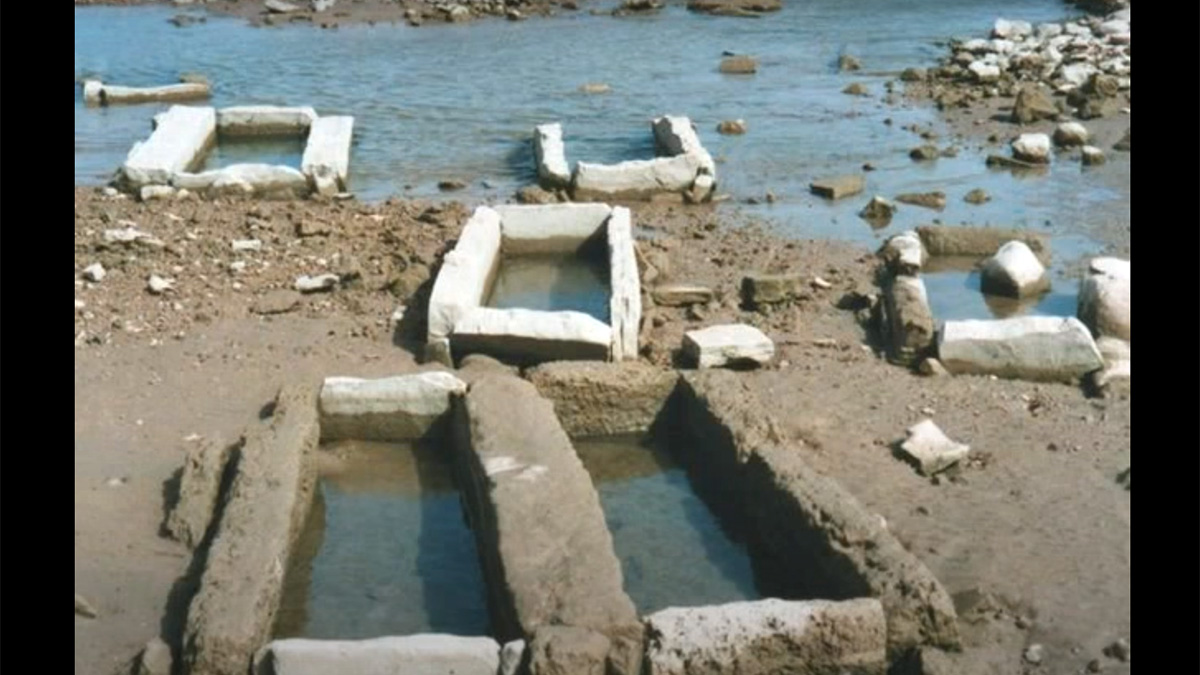 Cuando baja el nivel del agua, es posible ver distintas partes de las construcciones y trozos de rocas que han aguantado de las edificaciones.
