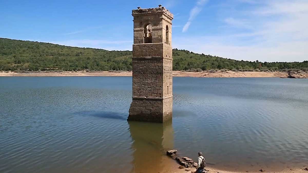 El embalse de la Cuerda del Pozo es el responsable de la desaparición del pueblo de La Muedra, en Soria. Unas aguas que arrasaron con todo a su paso, pero que no pudieron derribar el campanario del antiguo pueblo. Una imagen espectacular que permite ver cómo esta construcción asoma de entre las aguas.