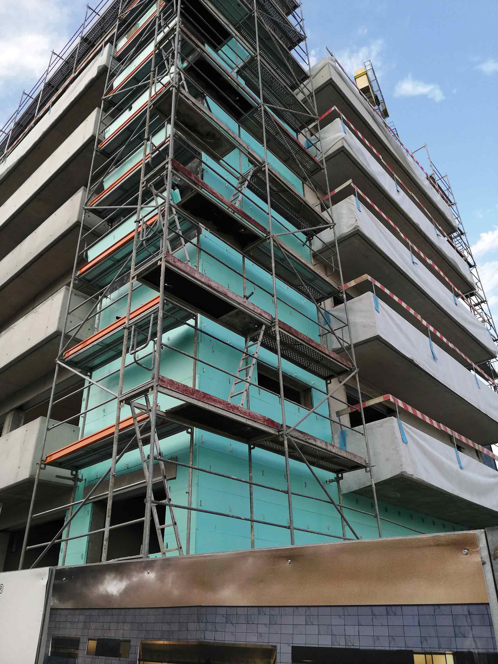 El material XPS, poliestireno extruido o extrusionado, es una espuma rígida compuesta por una estructura de células cerradas que puede instalarse tanto en el exterior de las viviendas como en el suelo. En la imagen puedes ver el proceso de instalación del revestimiento en la fachada de un edificio.
