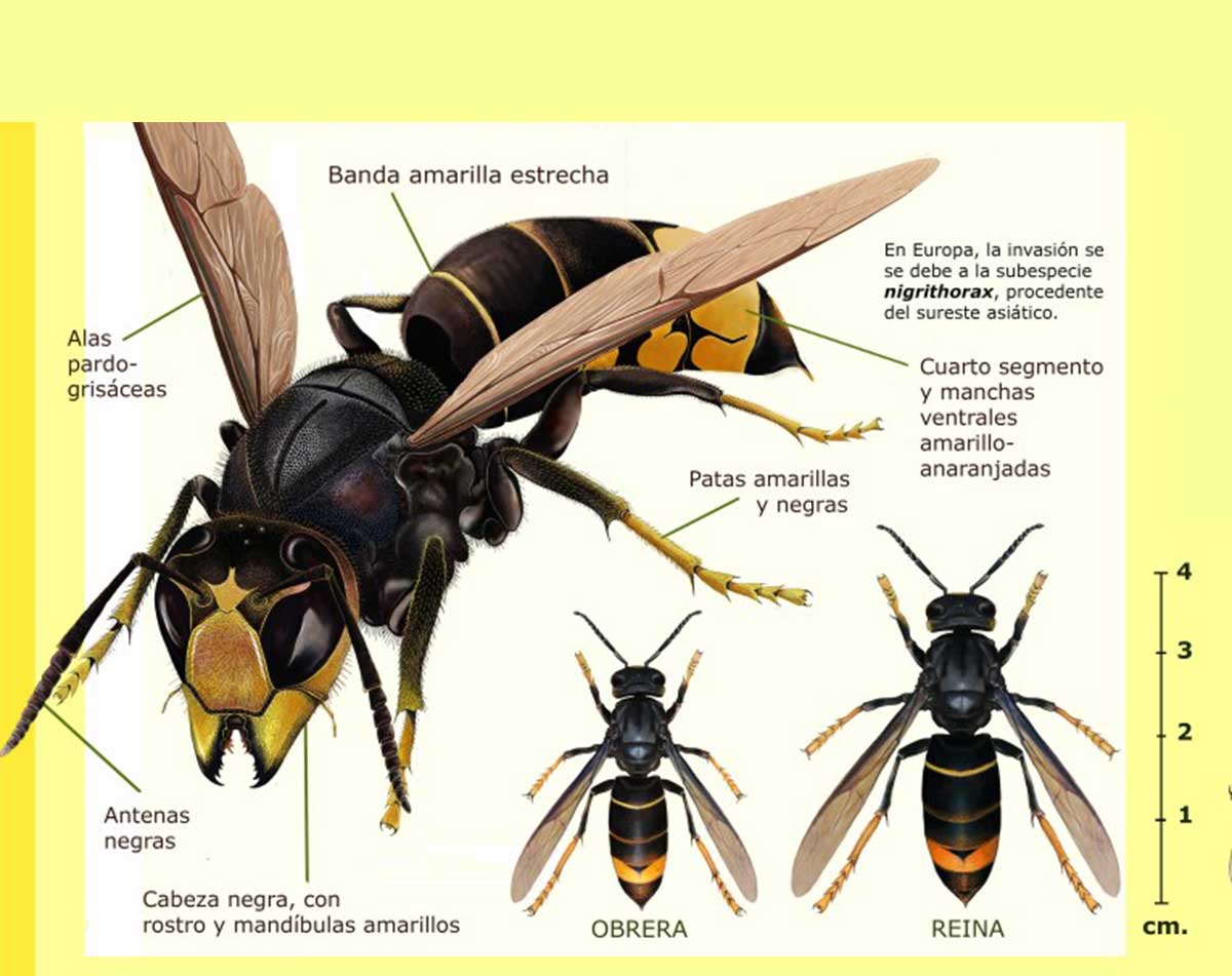 - Otro rasgo característico de las avispas asiáticas es que todas las patas tienen un degradado de colores. En la parte más pegada al cuerpo son negras, pero cambian a color amarillo en los extremos de las patas. Mientras que las autóctonas son de color amarillo en su totalidad.