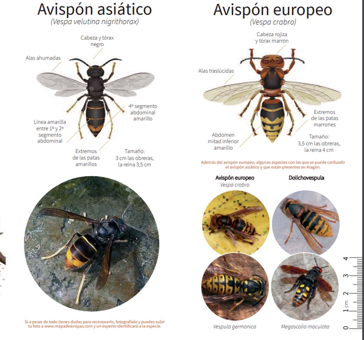 - De un vistazo general, la avispa asiática es de tonos más oscuros, marrones y negros. Mientras que la avispa común se caracteriza por su combinación de tonos negros y amarillos.