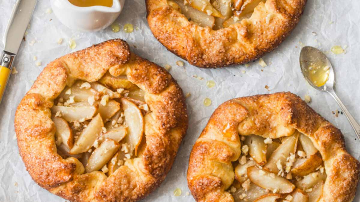 - Coloca las rodajas de pera en círculos decorativos superpuestos en la parte enharinada de la corteza. Limpia el zumo de pera que pueda haber quedado sobre las rebanadas y dobla el borde sobre el relleno.